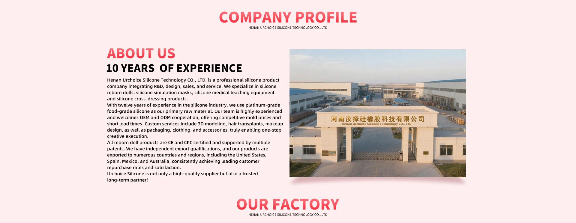 Produk utama: Boneka silikon, masker manusia hidup silikon, model pendidikan medis silikon, produk penata silang silikon, celana peningkatan bokong silikon